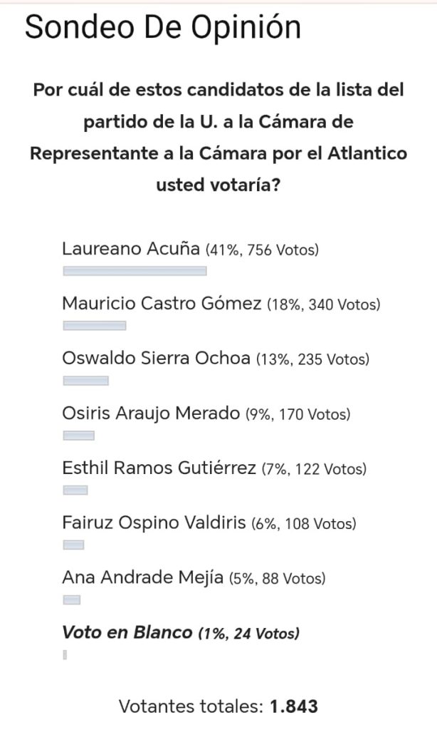 El portal web de noticias Canal Tropical realizó recientemente un sondeo de opinión sobre la preferencia de la lista de candidatos a la Cámara de Representantes por el Partido de la U en el departamento del Atlántico, ejercicio que arrojó resultados favorables para el exsenador Laureano Acuña Díaz.