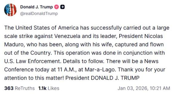 En el anuncio, que ha publicado a través de un post en su cuenta de en su red Truth Social, Tump ha señalado el “éxito” de su “ataque a gran escala contra Venezuela y su líder”, que está “junto con su mujer, capturado y fuera del país”. “Esta operación se llevó a cabo en colaboración con las fuerzas del orden estadounidenses. Se darán más detalles próximamente”, ha apuntado en su post.