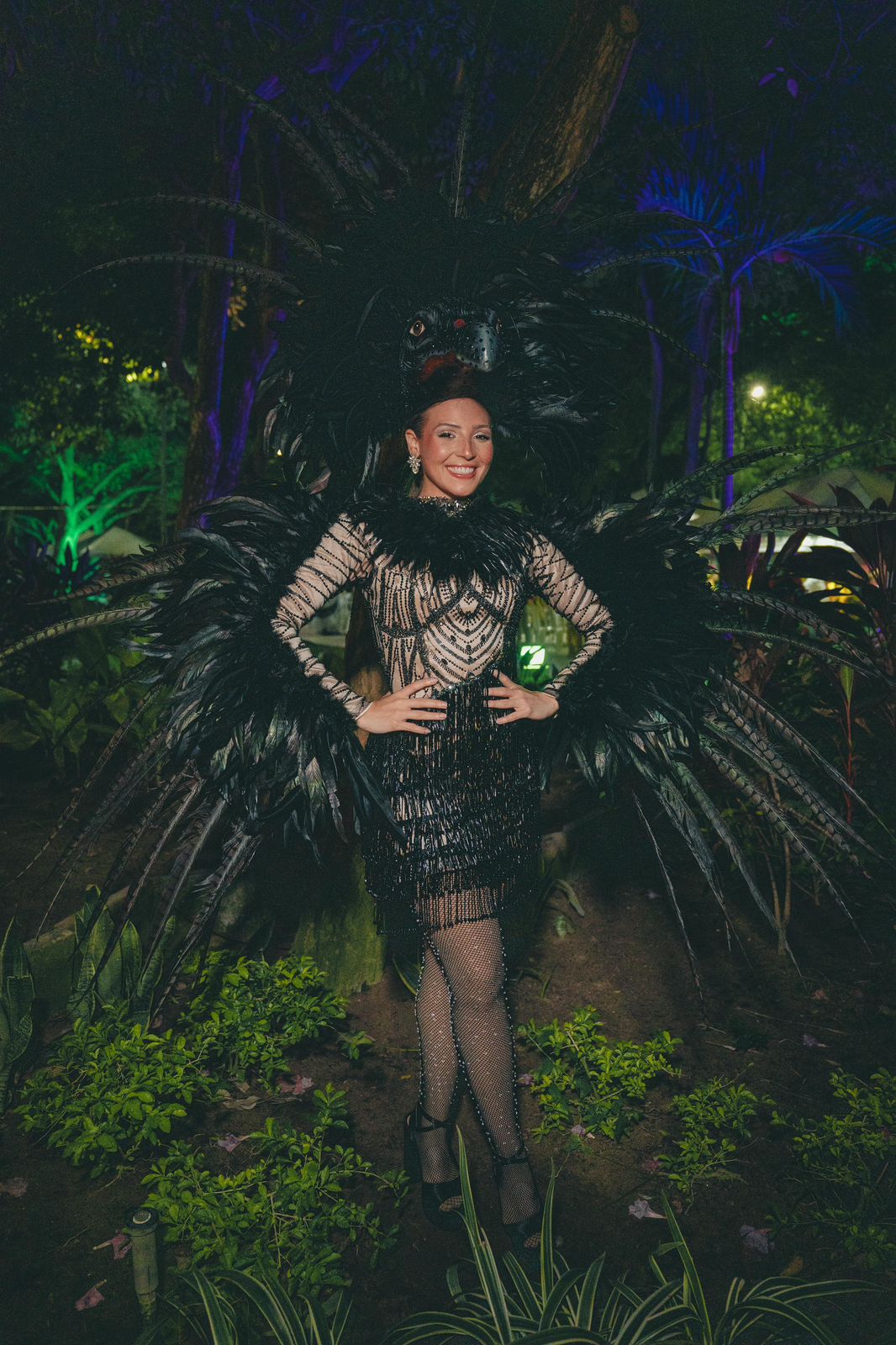 La pieza estuvo construida a partir de múltiples flecos de cristales color negro humo, superpuestos sobre una base recamada en canutillos sobre tul, resaltando la fluidez del ave en pleno vuelo y el sigiloso movimiento del golero frente a su presa. La máscara, chispeada con cristales, representó la tradición viva elevada a joya cultural, mientras que las alas, elaboradas con plumas de gallo y faisán, evocaron el vuelo, la libertad y la capacidad de regresar siempre al Carnaval con el valor intacto de su tradición.