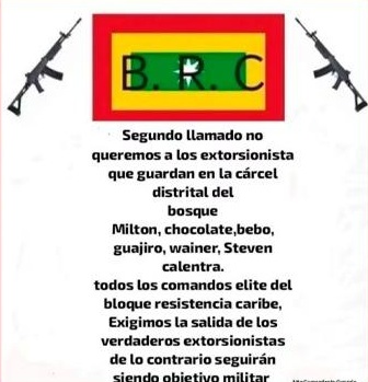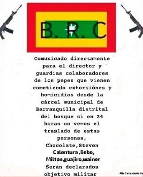 «Si en 24 horas no vemos traslado de estas personas, alias ‘Chocolate’, ‘Steven’, ‘Calentura’, ‘Bebo’, ‘Milton’, ‘Guajiro’, ‘Wainer’, serán declarados objetivos militar», se lee en el panfleto. Circula un segundo panfleto haciendo un llamado adicional para que esos privados de la libertad sean trasladados.