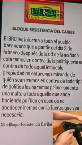 El panfleto, publicado a través de las redes sociales, indicaba que «a partir del día 2 de febrero después de las 8 de la mañana estaremos en contra de la politiquería, en contra de todo aquel inmueble propiedad, no estaremos mirando de quién sean, iremos en contra de todo tipo de política».