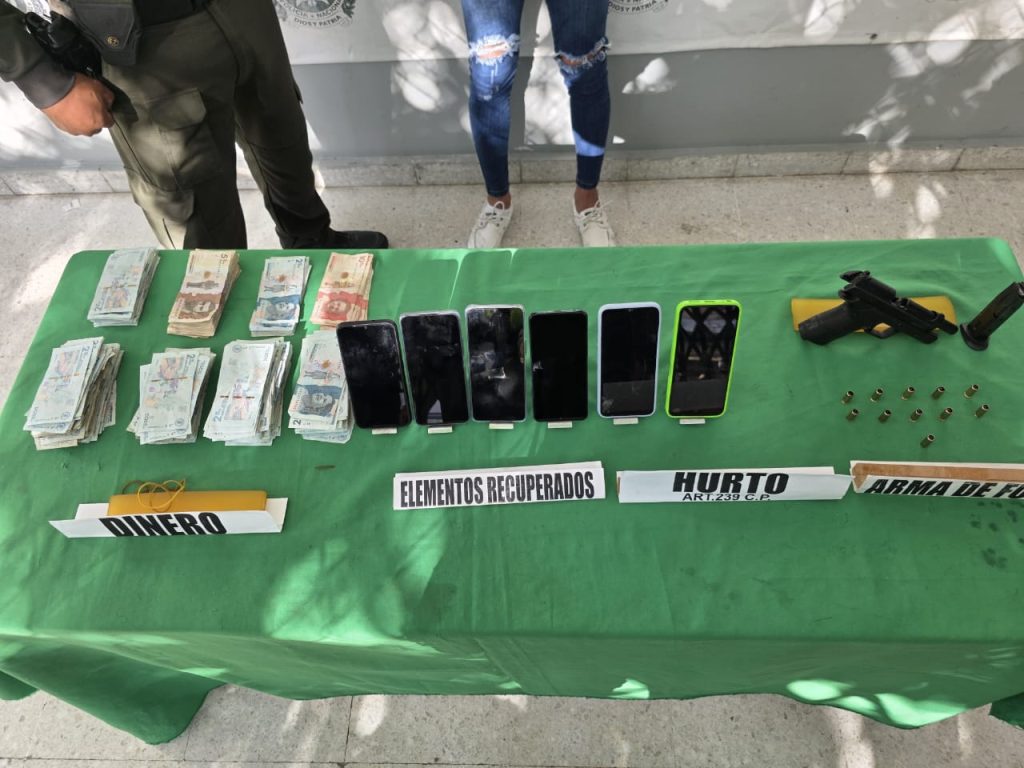 De igual manera, gracias a la oportuna reacción de los uniformados, se logró la recuperación de seis teléfonos celulares y dinero en efectivo, con un avalúo aproximado de 14 millones de pesos, elementos que habían sido hurtados durante el hecho.