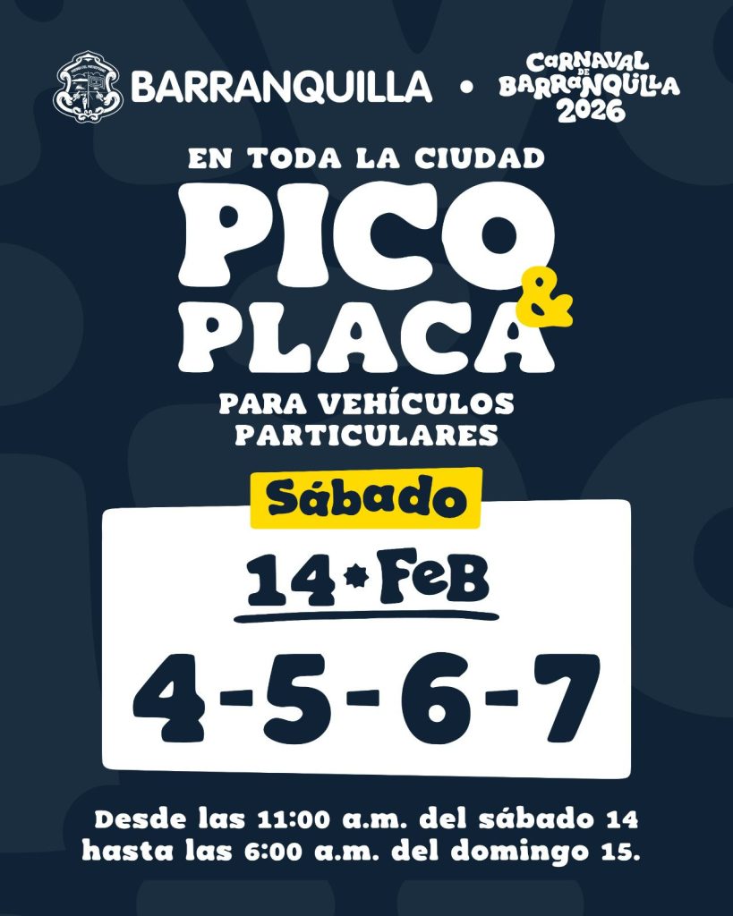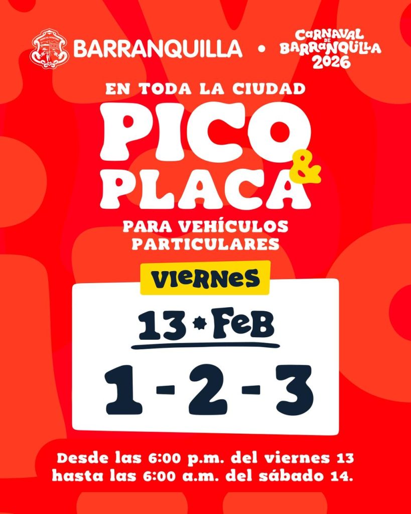 Por tal motivo, la Alcaldía de Barranquilla, a través de la Secretaría de Tránsito y Seguridad Vial, mediante el Decreto 0036 del 26 de enero de 2026, dispuso la implementación de la medida de pico y placa en toda la ciudad desde el viernes 13 de febrero hasta el lunes 16 de febrero, teniendo en cuenta el último dígito del número de placa: