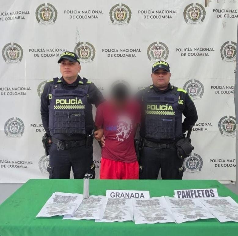 El procedimiento se desarrolló durante actividades preventivas de registro y control, cuando los policías interceptaron al sujeto y le hallaron en su poder panfletos extorsivos alusivos a un grupo delincuencial, así como una granada, elemento que generaba temor entre la comunidad y afectaba la tranquilidad del sector.
