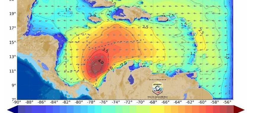 Para el resto del litoral sur, valores inferiores a 2.0 metros. Entre tanto, los vientos alcanzarán los 46 km/h en el sector norte, los 43 km/h en la zona central y entre 15 a 31 km/h en el sector sur; en el área insular se estima una altura de la ola de 1.3 metros en Providencia y 1.1 metros en San Andrés, con velocidades de vientos hasta de 37 km/h.