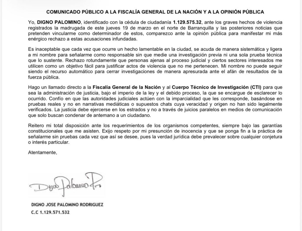 La reciente ola de violencia en el norte de Barranquilla ha desatado una inusual confrontación mediática entre los líderes de las dos estructuras criminales más temidas de la región. Digno José Palomino, señalado cabecilla de ‘Los Pepes’, envió un contundente comunicado a la Fiscalía General de la Nación rechazando su responsabilidad en el atentado ocurrido la madrugada del jueves en un billar del norte de la ciudad.