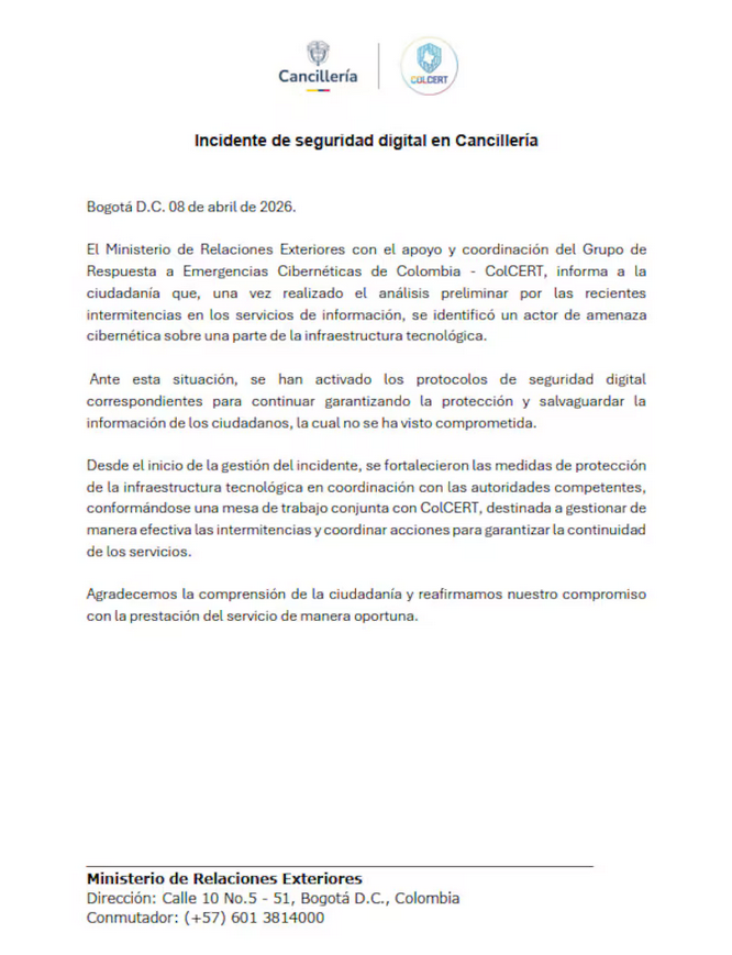 De acuerdo con el comunicado oficial, la situación fue detectada tras una revisión técnica adelantada con el apoyo del ColCERT, que permitió identificar afectaciones en una parte de la infraestructura tecnológica de la entidad. No obstante, la Cancillería fue enfática en señalar que la información de los ciudadanos no se ha visto comprometida.