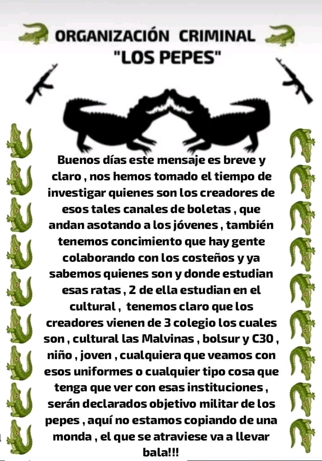 En el pasquín se logra leer textualmente: “Buenos días, este mensaje es breve y claro, nos hemos tomado el tiempo de investigar quiénes son los creadores de esos tales canales de boletas, que andarán azotando a los jóvenes, también tenemos conocimiento que hay gente colaborando con ‘Los Costeños’ y ya sabemos quiénes son y donde estudian esas ratas, 2 de ellas estudian en el cultural, tenemos claro que los creadores vienes de tres colegios los cuales son, Cultural las Malvinas, Bolsur y C30. Niño, joven y cualquiera que veamos con esos uniformes o cualquier tipo de cosa que tenga que ver con esas instituciones, serán declarados objetivo militar de ‘Los Pepes’, aquí no estamos copiando de una xxxxx, el que se atraviese va a llevar bala”.