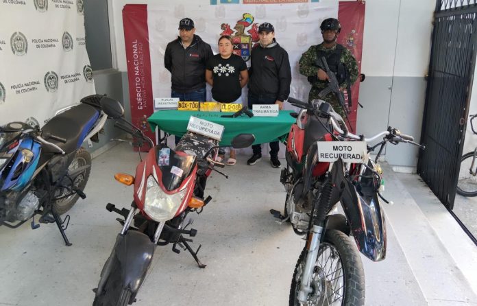 En otro resultado operacional, mediante orden de allanamiento ejecutada en el barrio Villa Las Moras, en coordinación entre el Ejército Nacional, el CTI de la Fiscalía y la Fiscalía 61 Seccional, se logró la captura en flagrancia de una mujer identificada como María Isabel Marrugo Caro, de 36 años. Durante el operativo se incautaron tres motocicletas, placas, licencias de tránsito y un arma traumática con su respectiva munición, elementos que serán objeto de investigación para determinar su posible relación con actividades delictivas.