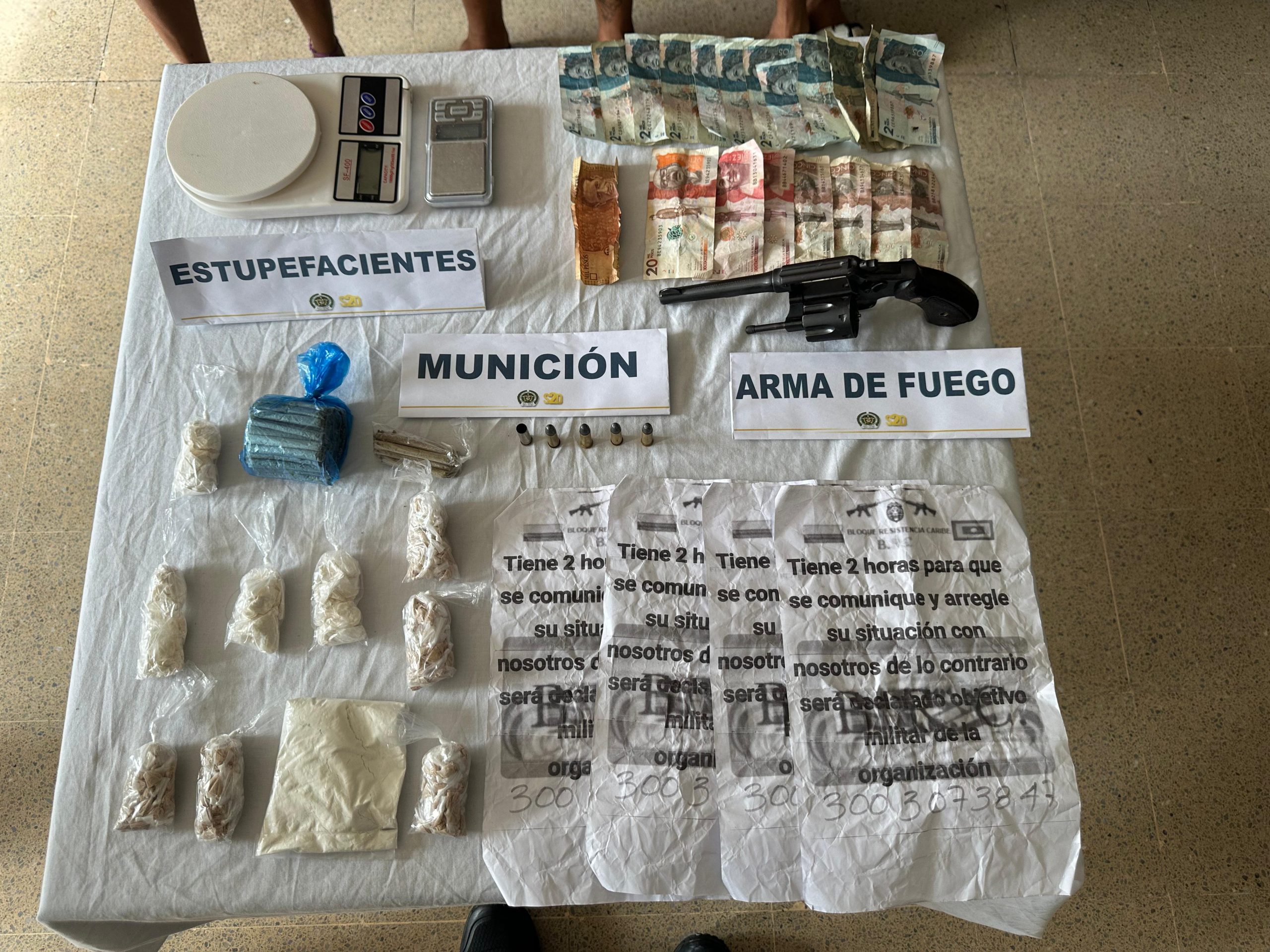 El procedimiento policial se llevó a cabo en vía pública del corregimiento La Peña, municipio de Sabanalarga, donde fueron capturados en flagrancia alias “Micky”, alias “Luis” y alias “La Pequeña”. Durante el operativo, mediante actividades de registro y control, les fueron hallados en su poder un arma de fuego tipo revólver calibre 38, cartuchos, sustancias estupefacientes, pasquines alusivos a esta estructura criminal y un equipo celular.