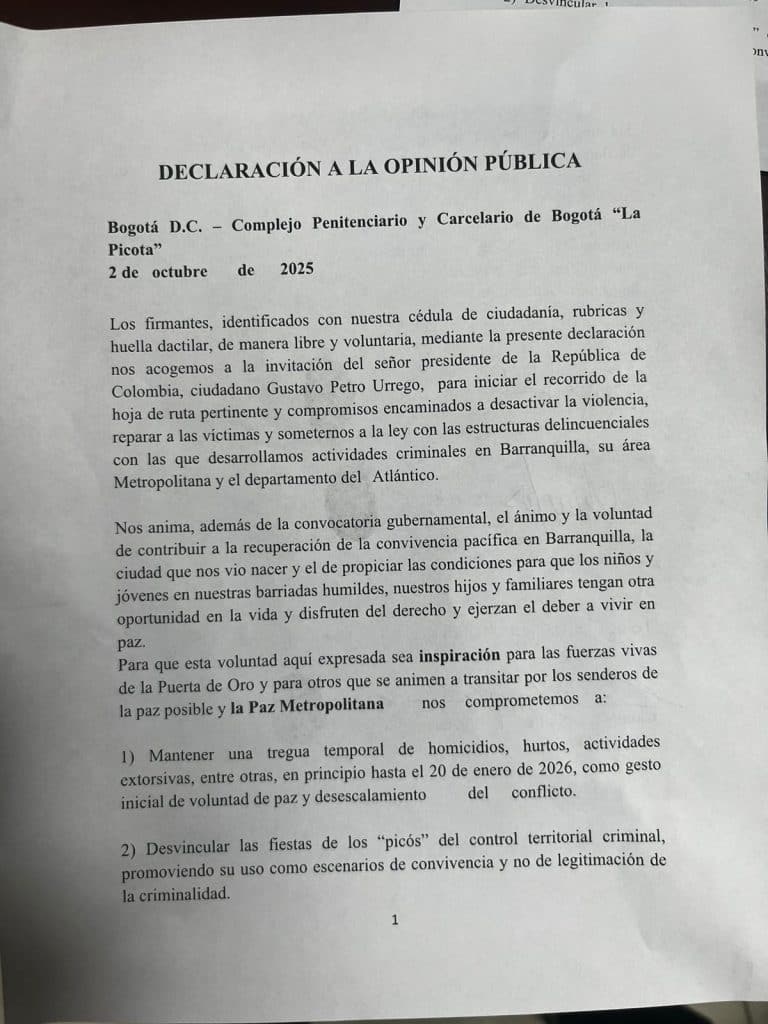 Los líderes de las estructuras, que mantienen el control ilegal en varias zonas de Barranquilla y su área metropolitana, sellaron el documento con tres acuerdos fundamentales, buscando que esta voluntad sea una «inspiración para las fuerzas vivas de la Puerta de Oro»: