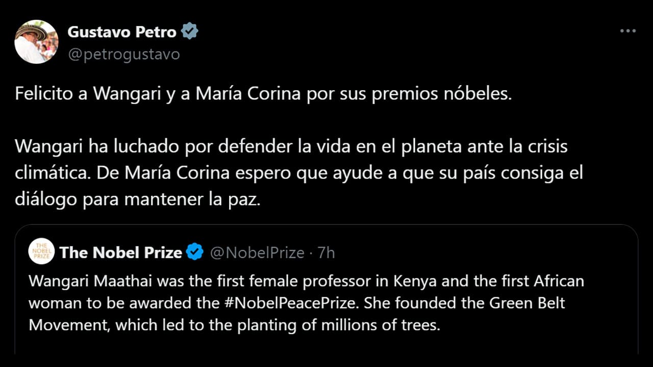 El mandatario colombiano también mencionó la referencia que la organización noruega hizo de Wangari Maathai, la primera mujer africana en recibir el Nobel de Paz, en 2004, al anunciar el galardón a líder venezolana.