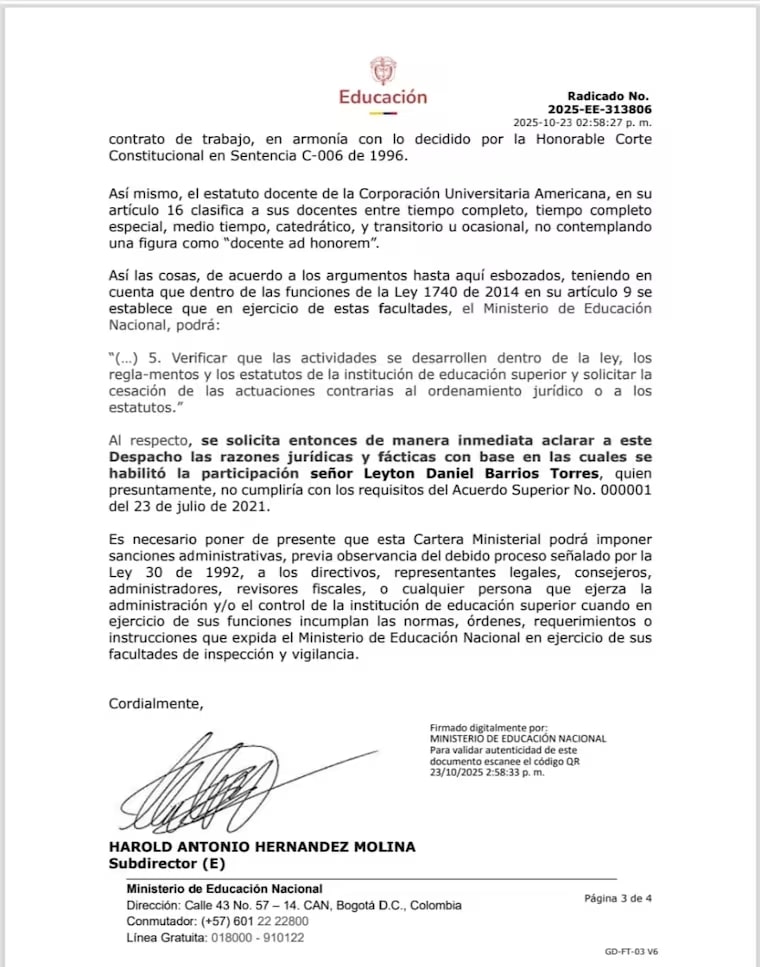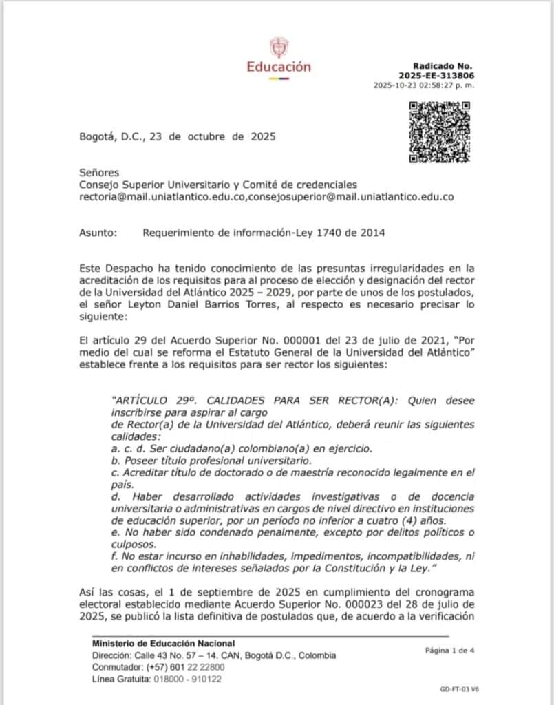 El Ministerio de Educación envió un oficio al Consejo Superior de la Universidad del Atlántico solicitando explicaciones sobre el proceso mediante el cual fueron admitidos los documentos de postulación de Leyton Daniel Barrios Torres como candidato a la rectoría para el periodo 2025–2029.